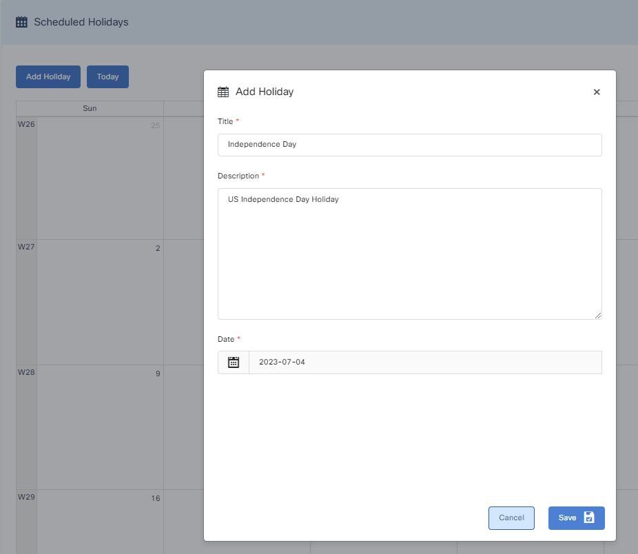 To add a holiday in the calendar, press add holiday button and enter the details of the holiday.