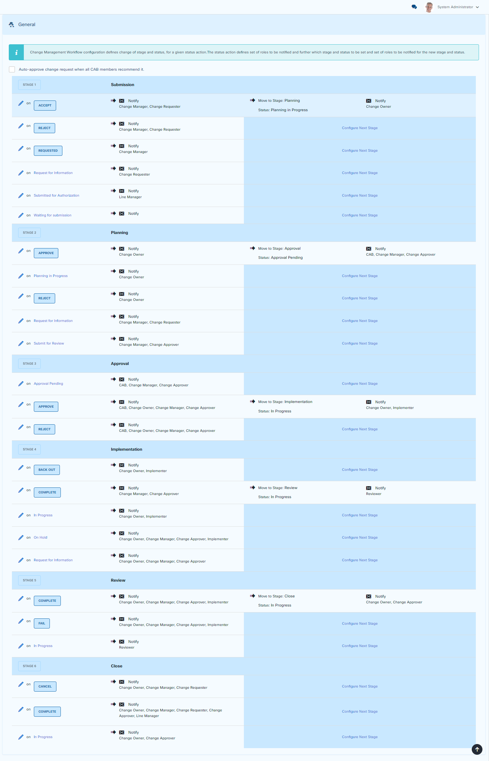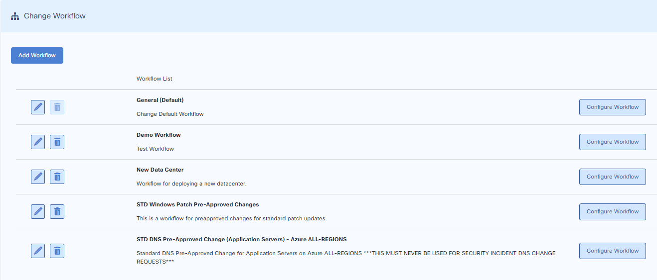 A default Change Workflow is provided. You can customize the default or create separate Change Workflows according to your needs.