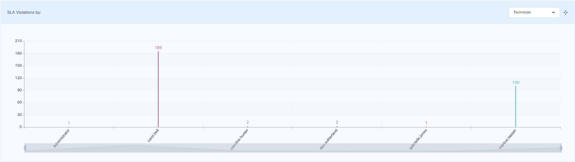 SLA violations can be filtered by Technician, Priority, Level and Category.