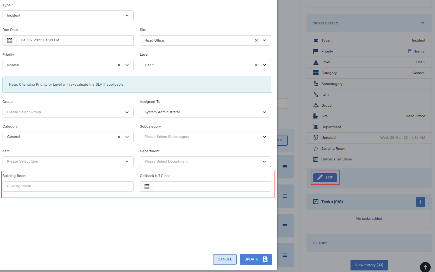 Ticket > Edit Ticket Details > Enter data for your custom fields