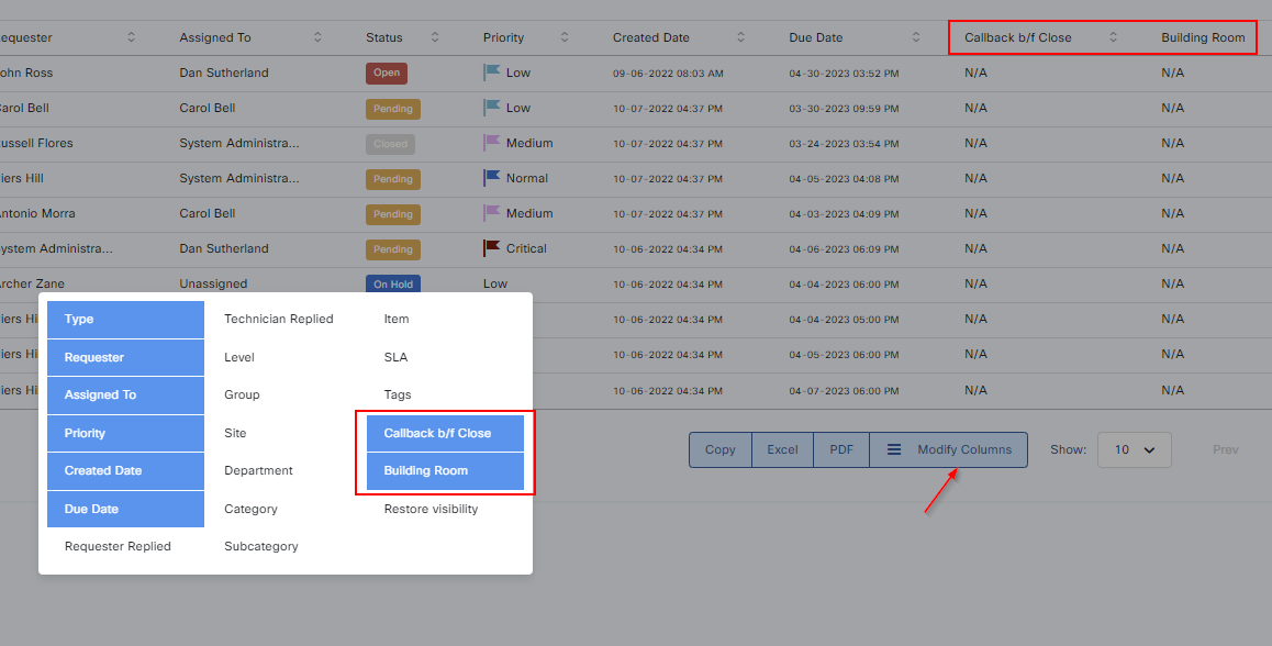 You can see these fields now under modify columns in ticket list view. Press your new fields and click outside to exit.