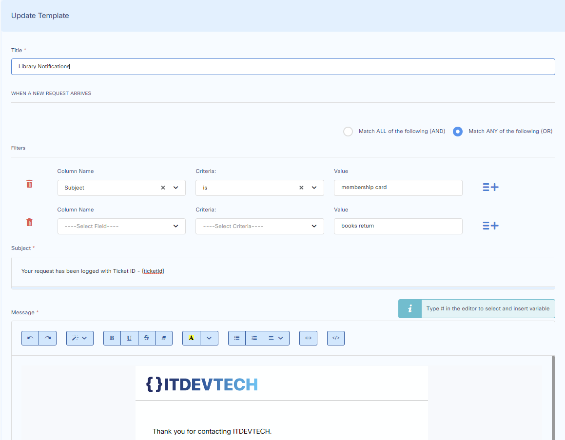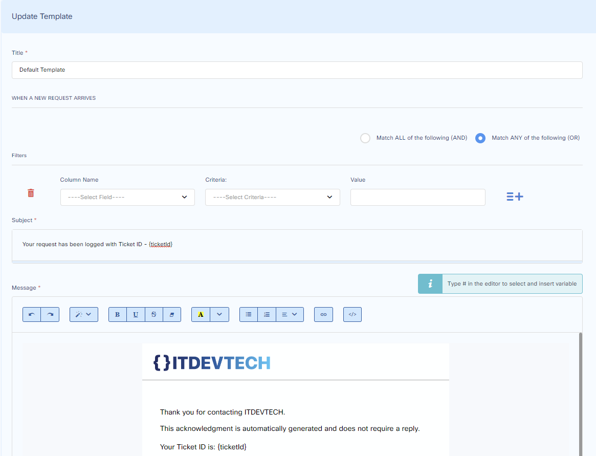 Notification email which will be sent to the requester when new ticket is received by the helpdesk.