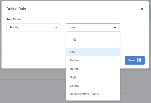 The AND/OR condition is between Rules which are Level: Tier 1 and Priority: Low.