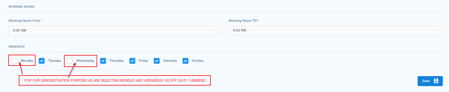Below you can see that Mon and Wed are taken as OFF days. The irrespective weekend options will apply to Monday and Wednesdays as well because the system will treat it as a weekend for this particular SLA.