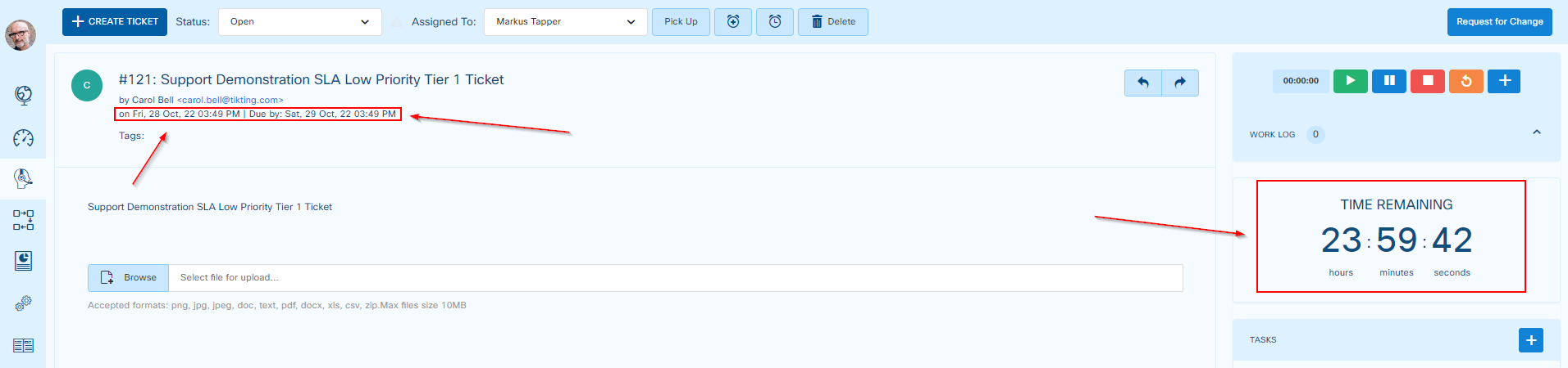Below the ticket was created to be resolved within 8 working hours. The Operational Hours are 9 AM to 5 PM. The Ticket was created on 03:49 PM and the due date is calculated as 03:49 PM exactly 8 working hours later.