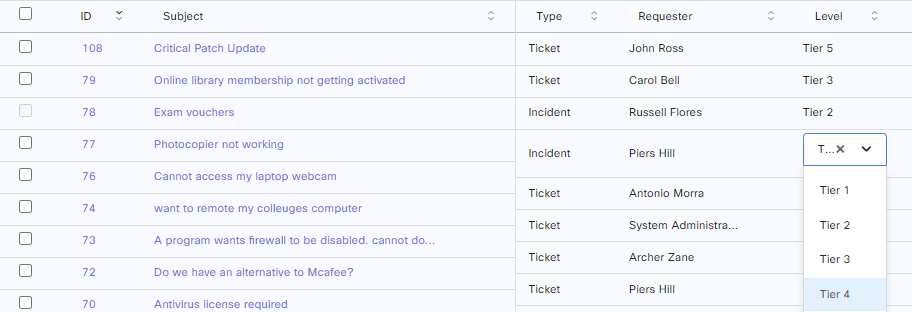 To update levels through inline editing, on the main tickets page, go to the ticket which you want to change the level > double click > a drop down menu appears from which the level should be selected and then clicking outside of the row will save.