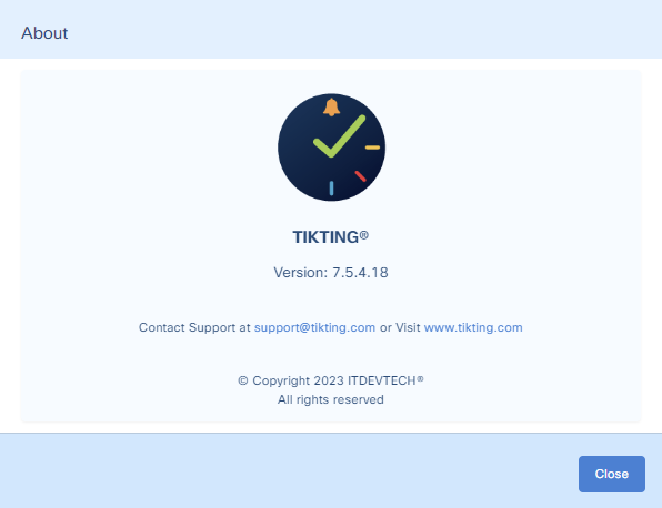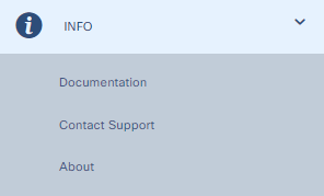 Info contains information regarding the version number of the software, links to support guides and contact information.
