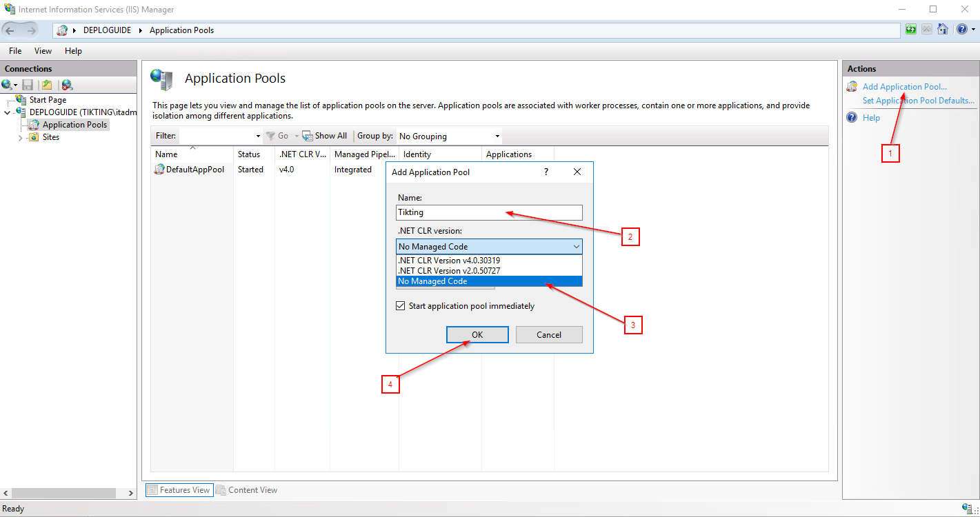 - Open the IIS Manager select Application Pool and click Add Application Pool.