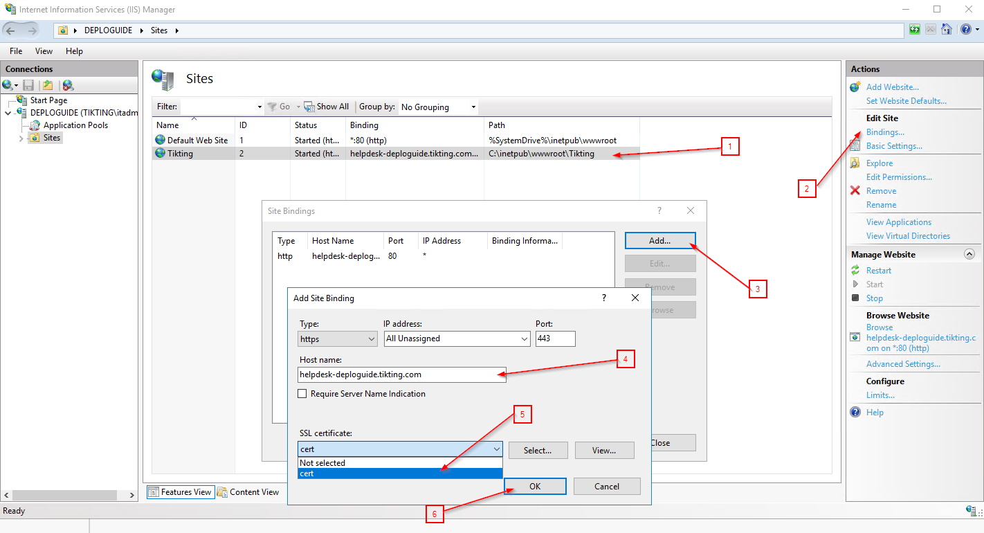 - Add Binding with the same hostname as in the previous step.