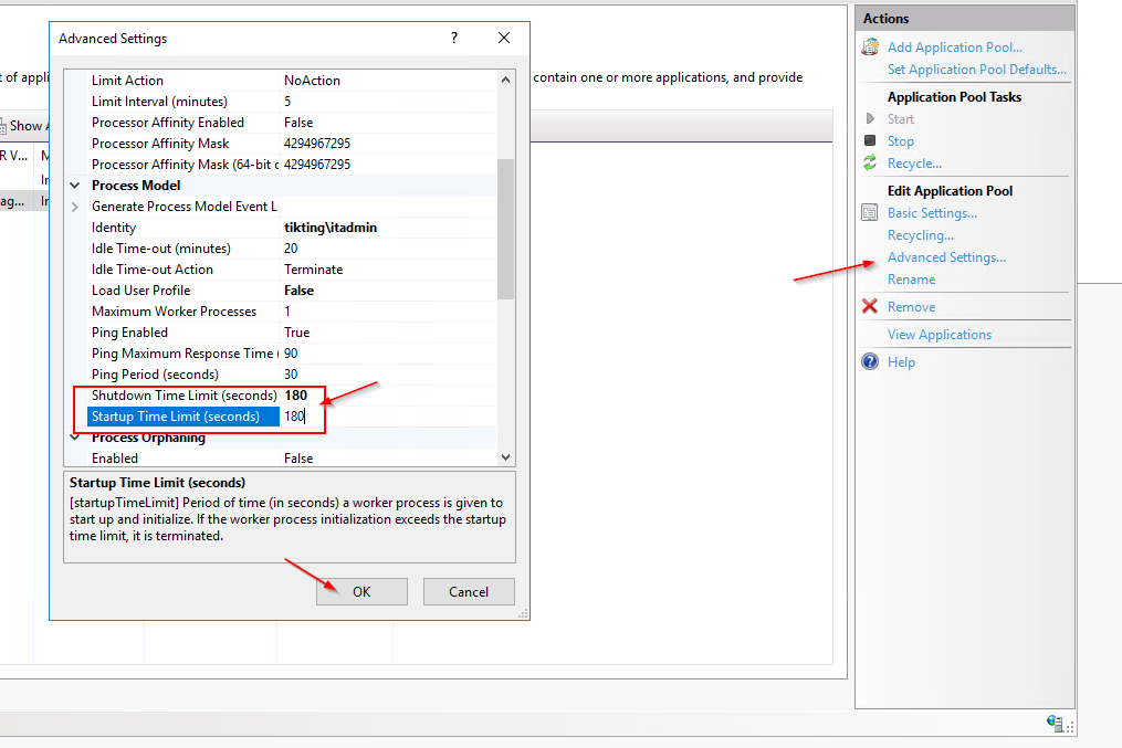 - Configure the IIS Idle Timeout Settings and rapid fail protection settings