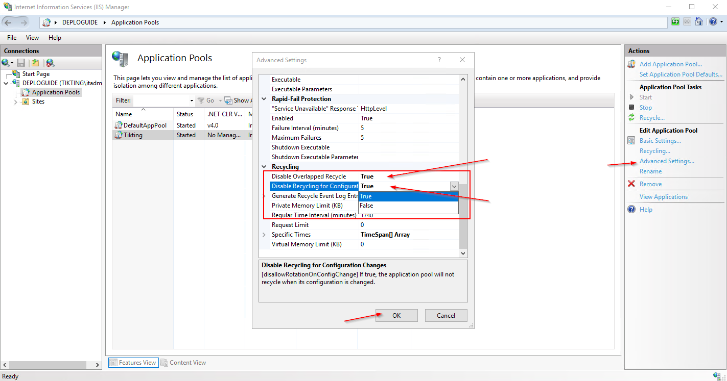 - Go to Disable Recycling for Configuration and Change it to TRUE.
