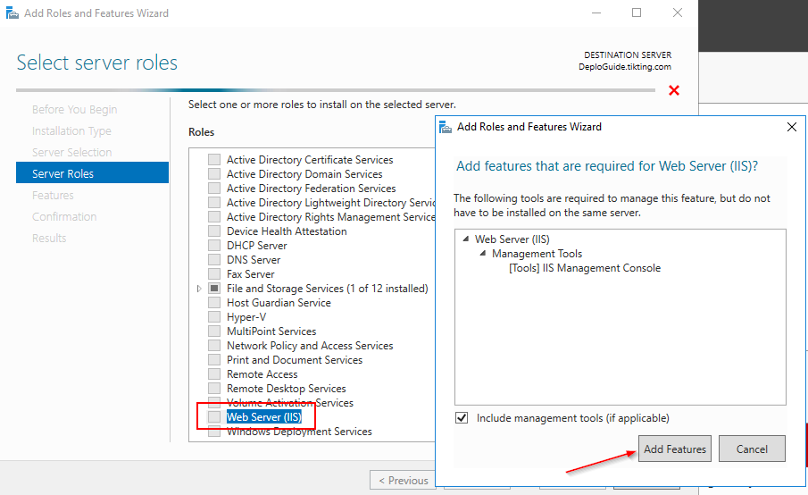 - From the list please select Web Server (IIS) and click ‘Add Features’.