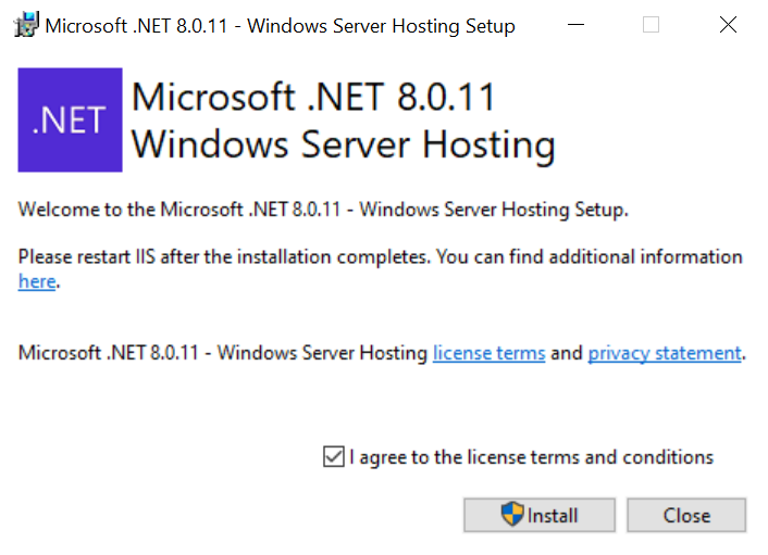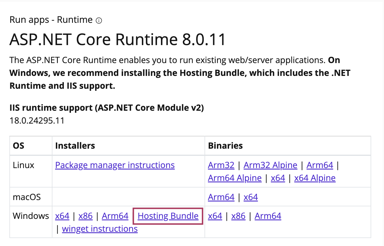 - Please download and install ASP.NET Core Runtime 8.x.x (Hosting Bundle)