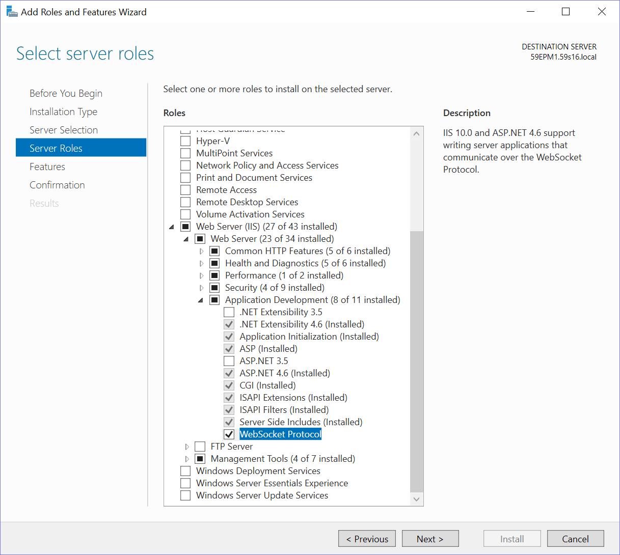 Go to Server Roles and Install the Web Socket Protocol