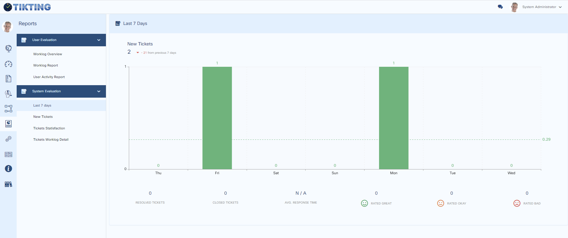 Report shows new tickets in the last 7 days included with key information like Resolved Tickets, Closed Tickets, Avg. Response Time and Ticket ratings.