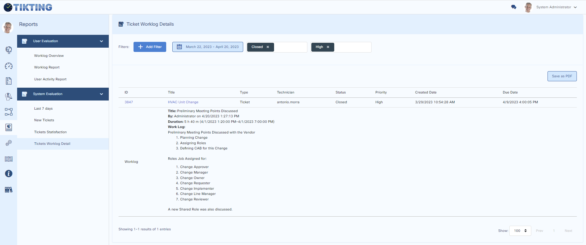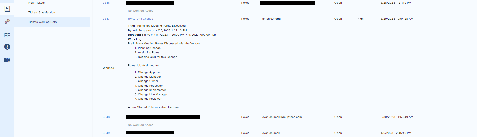 Report consists of two parts. Worklog report and Worklog details Worklog Report (Details) shows time taken to resolve tickets by the technician.