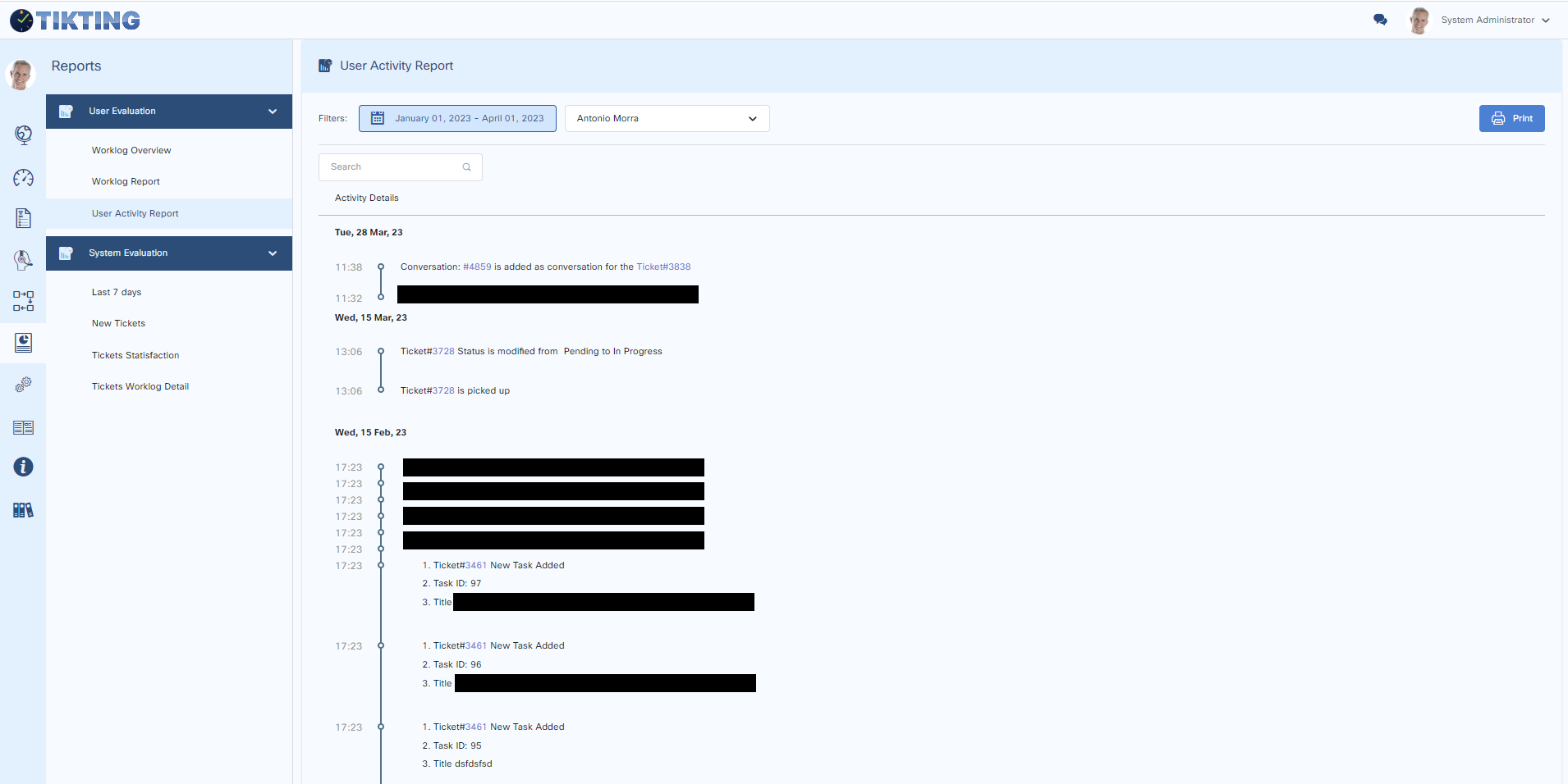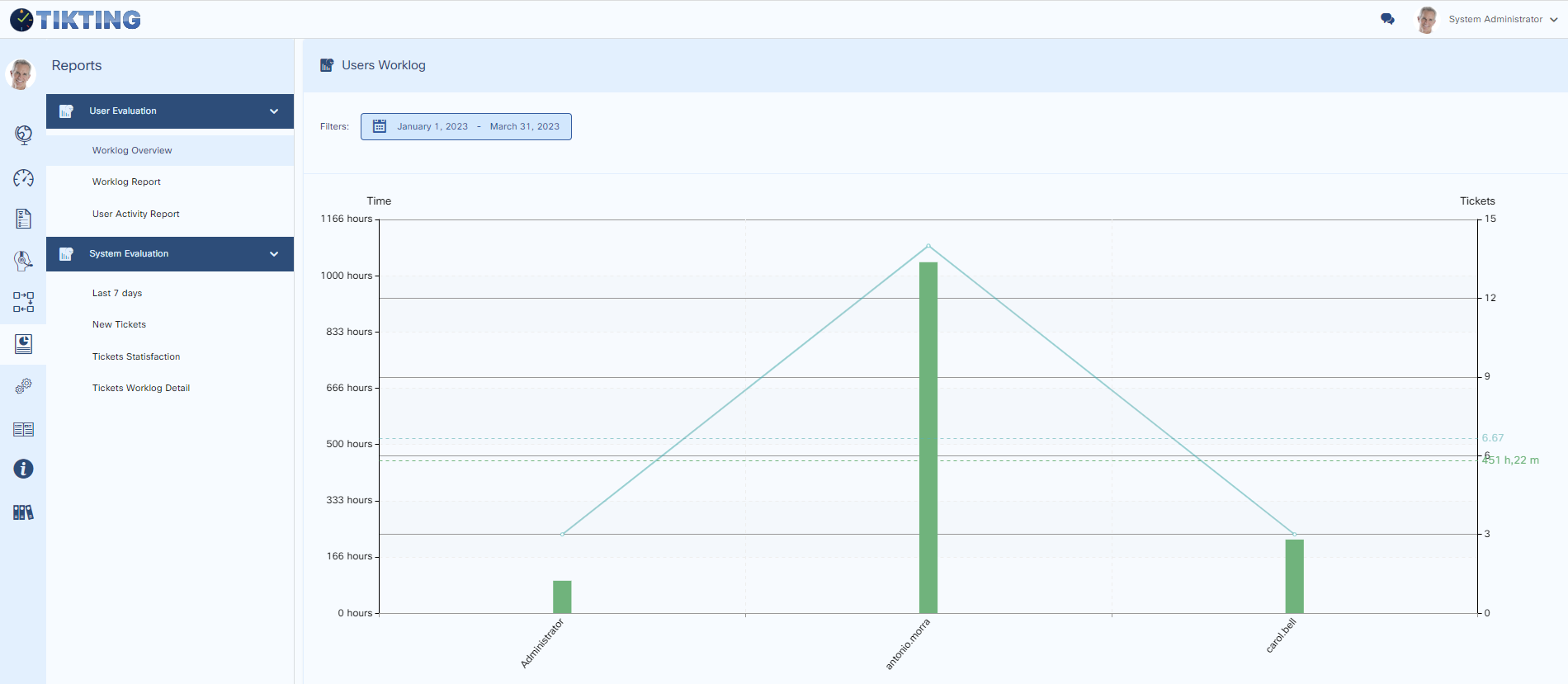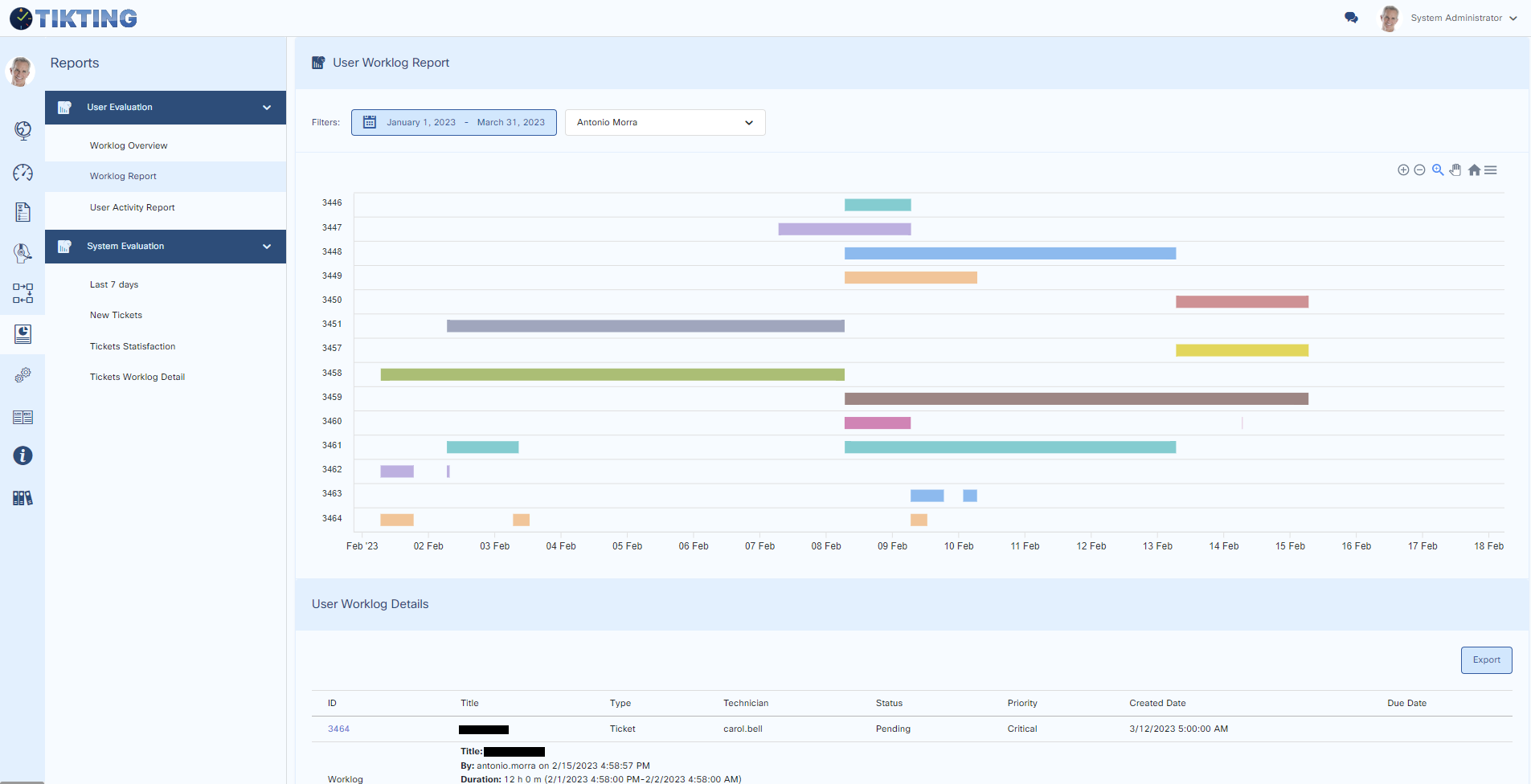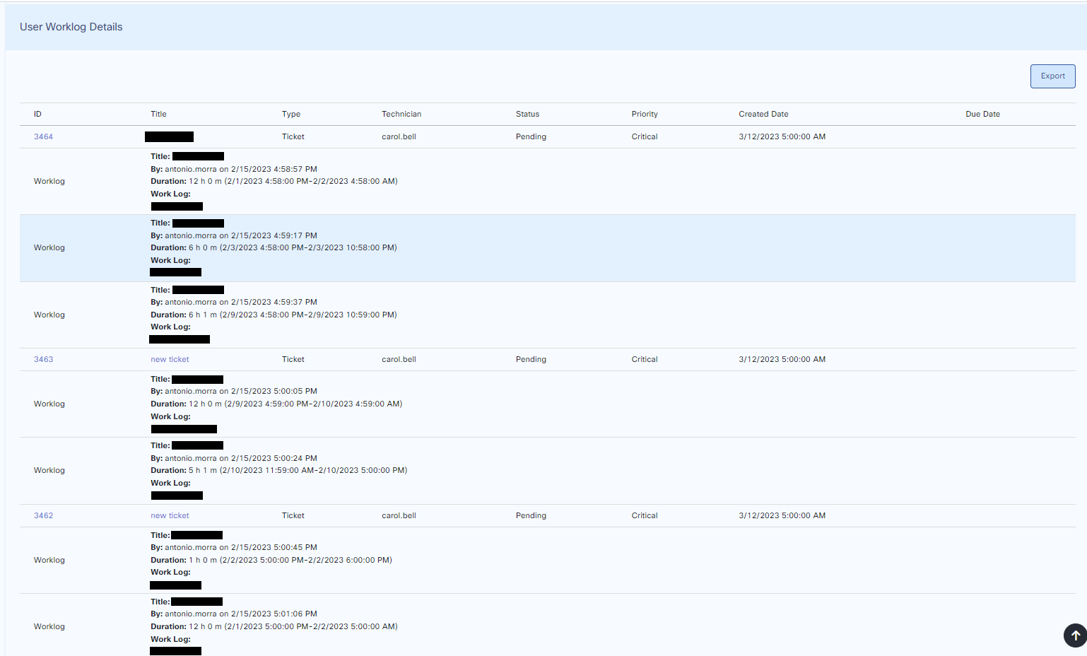 On the same screen, details are shown of each ticket by worklog, its duration and details.