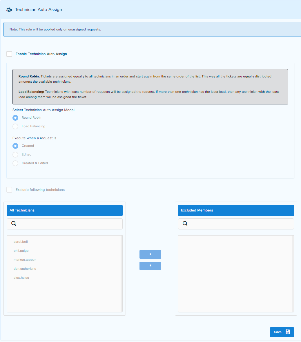 Round Robin: Round Robin: Tickets are assigned equally to all technicians in an order and start again from the same order of the list. This way all the tickets are equally distributed amongst the available technicians.